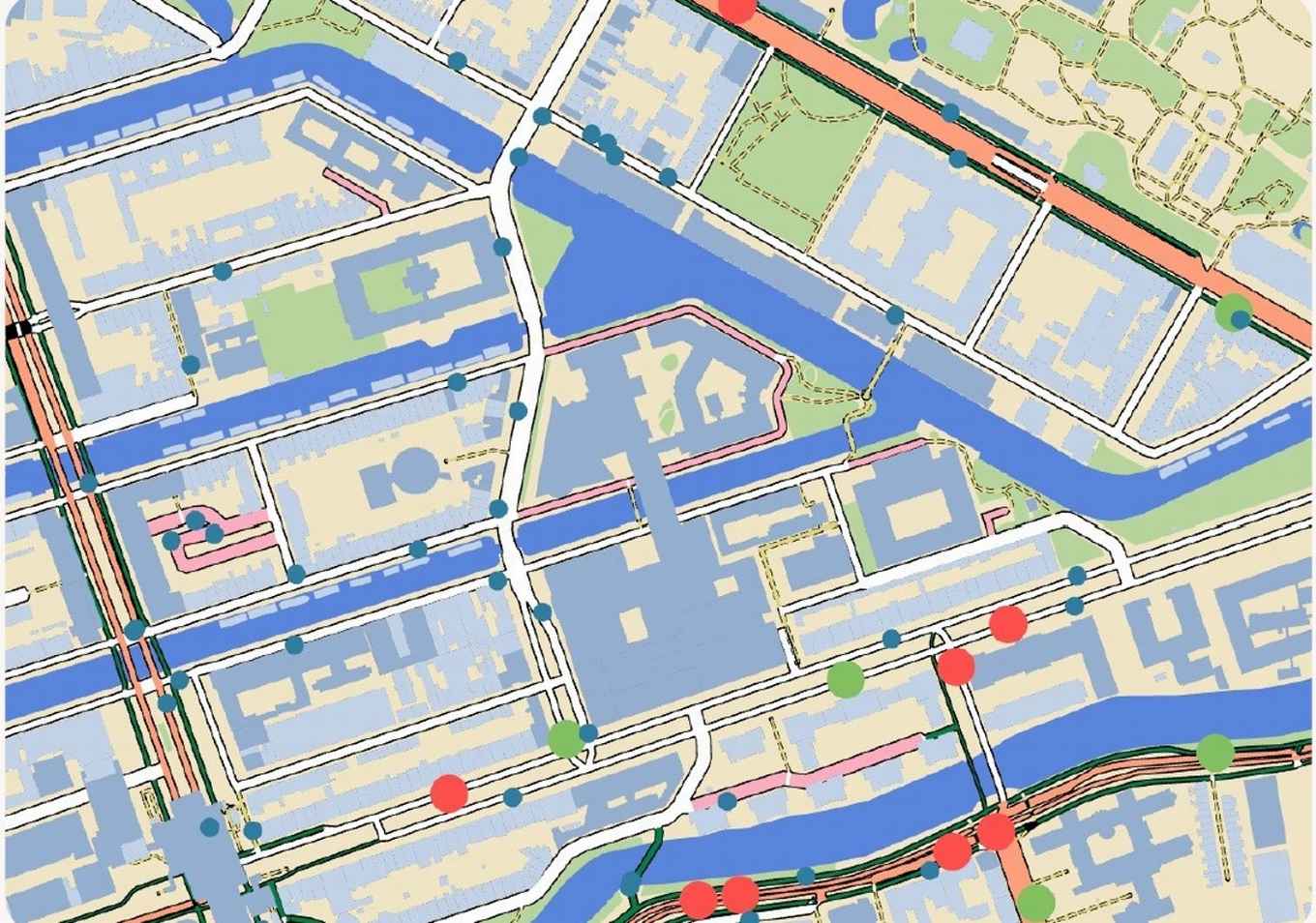We built a highly local model, focused on the area between Waterlooplein and Oosterpark. Each dot in the simulation represented a person, red for cars, blue for pedestrians, green for cyclists. We used the open-source platform A/B Street, but we built our own model inside it.