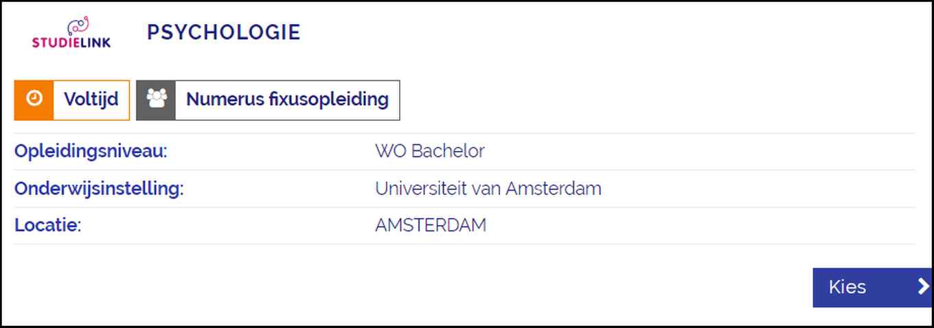 Wat als je straks niet door de selectieprocedure voor Psychologie komt? Zog voor een plan B en oriënteer je alvast op andere studies op het gebied van gedrag. Je kunt je voor twee studies tegelijk inschrijven. Word je niet geselecteerd voor Psychologie, dan sta je alvast ingeschreven voor een andere studie.
